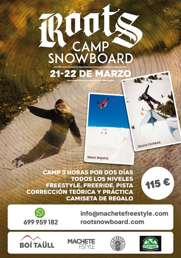 El Roots Snowboard camp 2026 de Machete Freestyle y La Petja con Bruno Forteza y Marc Bajona se celebrará el 21 y 22 de Marzo en la estación de Boí Taüll. El camp está dirigido a todos los snowboarders que quieran progresar en su nivel tanto a nivel de técnica de pista como freestyle, flat tricks, ollies 180's, 360's, 540's, iniciación en cajones y rails además de mucha diversión...